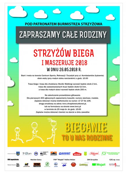 Już dziś zapraszamy do udziału w naszej cyklicznej imprezie "Strzyżów biega i maszeruje - 2018". Jak co roku będą biegi dla najmłodszych, dla wszystkich, dla zaawansowanych i marsz dla Nordic - walkerów. W ostatnią sobotę maja - 26 zapraszamy tradycyjnie na Łętownię całe rodziny.