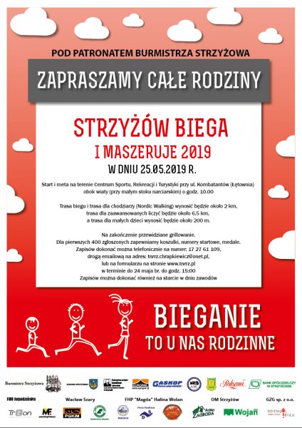 Już dziś zapraszamy wszystkich chętnych do poruszania się na świeżym powietrzu. Zapraszamy całe rodziny. Każdy znajdzie coś dla siebie. Dla najmłodszych bieg na dystansie 400 m, dla wszystkich bieg na 2 kilometrowej trasie, dla mocnych biegowo – wymagająca trasa na 6,5 km, a dla niebiegających marsz na krótkiej 2 km trasie. Dla sportowych rodzin (uczestniczyć muszą przedstawiciele trzech pokoleń –wnuczek/wnuczka - tata/mama – babcia/dziadek) przewidziane nagrody specjalne.